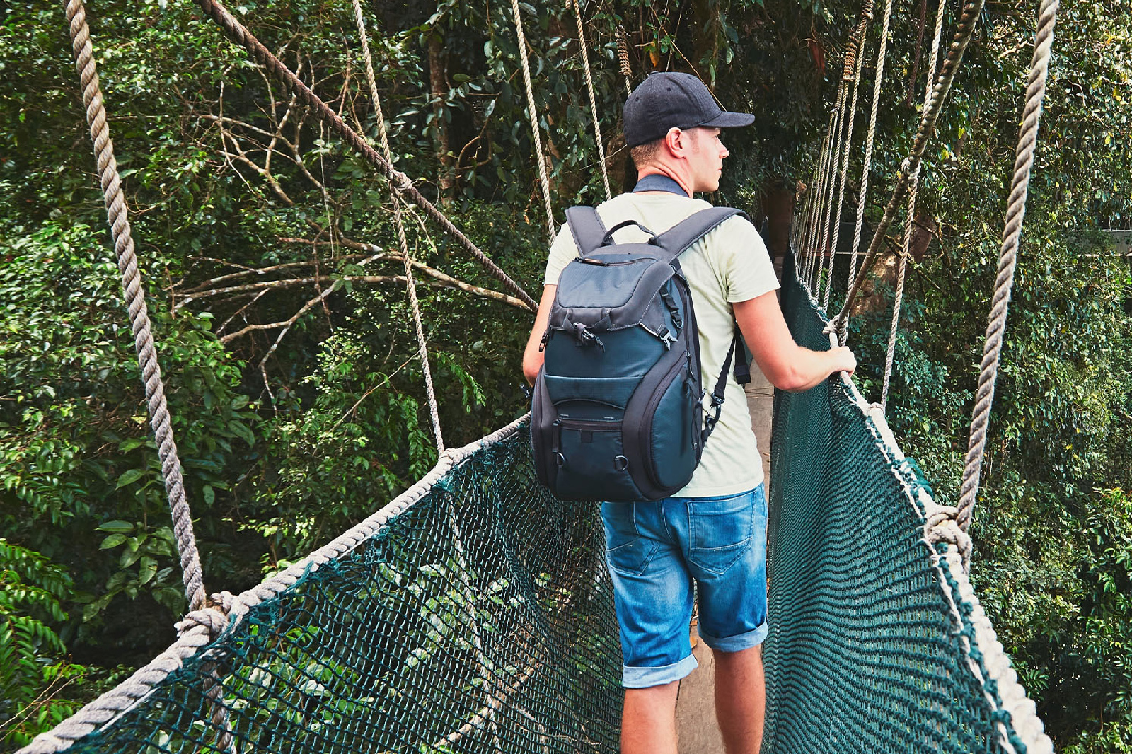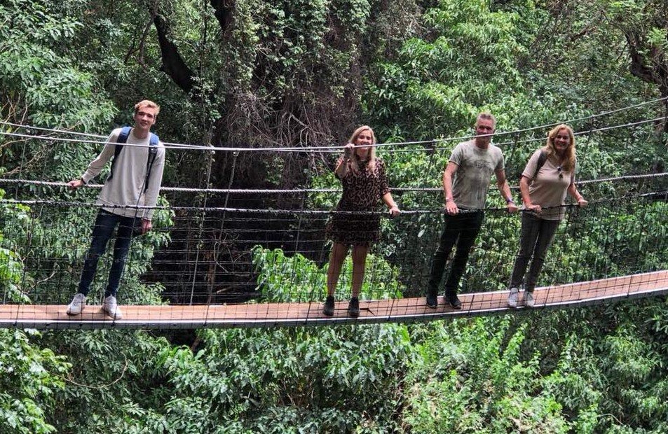 This 470m airwalk starts with a short board-walk that gradually rises from ground level up through the canopy of the forest. You walk over a series of suspension bridges with thick netting on the sides, and reach a height of 18m off the ground. Each of the bridges end on a viewing deck situated around tree trunks. These treetop platforms are perfect places to stop and enjoy life in the canopy amongst butterflies, monkeys and birds. There are 10 bridges and 9 platforms.