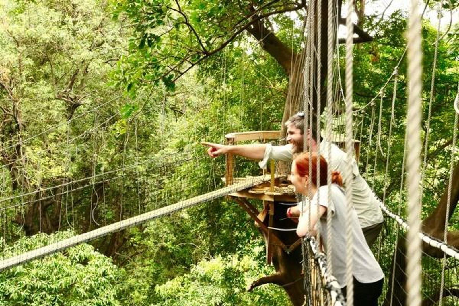 Lake Manyara Treetop walkway A different perspective with the treetop walkway! The Treetop walkway or canopy walk is the first and longest treetop walkway in Tanzania. Walk among the treetops and experience the untouched nature of the forest and its wildlife from a unique perspective. The Treetop walk is 370m long and reaches a height of 18m above ground. The walkway consists of a series of bridges, each of the bridges end on a viewing deck situated around tree trunks. These treetop platforms are perfect places to stop and view the surroundings or take a photo.